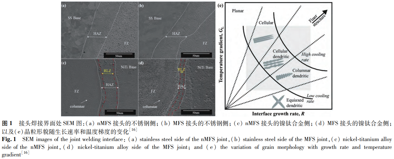Farhang等使用激光焊連接鎳鈦合金與不銹鋼,探究了外磁場(chǎng)對(duì)焊接接頭的影響。其中,無外磁場(chǎng)輔助的焊接記為nMFS,外磁場(chǎng)輔助的焊接記為MFS兩種接頭焊縫界面處的SEM圖如圖1所示。從圖1中可以觀察到,在這兩種接頭中均出現(xiàn)從熔合區(qū)中心向熱影響區(qū)的晶體形態(tài)轉(zhuǎn)變的現(xiàn)象。在nMFS接頭中,從熔合區(qū)中心至不銹鋼側(cè),晶體形態(tài)呈現(xiàn)出由等軸晶粒向柱狀晶再到平面晶的轉(zhuǎn)變;而從熔合區(qū)中心至鎳鈦合金側(cè),晶體形態(tài)的變化則為等軸晶粒、柱狀晶直至胞狀晶,且其中柱狀晶粒的取向與冷卻方向相互平行。該研究表明,這些相變行為與界面處的溫度梯度和生長(zhǎng)速率有關(guān),圖1e對(duì)凝固過程進(jìn)行了歸納。具體來說,在熔合區(qū)中心,G值較低,R值較高,促使枝晶生長(zhǎng)形成等軸晶。在從熔合區(qū)中心向基材移動(dòng)的過程中,G值和R值改變,形成柱狀、胞狀/平面結(jié)構(gòu)。磁場(chǎng)對(duì)電子運(yùn)動(dòng)的影響改變了電子在凝固和生長(zhǎng)過程中所攜帶的能量。因此,在MFS接頭中觀察到不同于nMFS接頭的凝固現(xiàn)象。相較于nMFS接頭,MFS接頭中熔合區(qū)中心形成較細(xì)的等軸晶粒(如圖1a、b所示),這是由于磁場(chǎng)降低G值的同時(shí)增加了R值。且熔融材料受到洛倫茲力的影響發(fā)生旋轉(zhuǎn),使原本平行于冷卻方向的柱狀晶粒(位于從熔合區(qū)向鎳鈦合金轉(zhuǎn)變處)取向改變,呈隨機(jī)取向(見圖1d)。此外,磁場(chǎng)使電子運(yùn)動(dòng)偏移造成的熱輸入減少以及磁場(chǎng)促進(jìn)熔體運(yùn)動(dòng)引起的冷卻速率加快共同導(dǎo)致MFS接頭的反應(yīng)層區(qū)更窄。