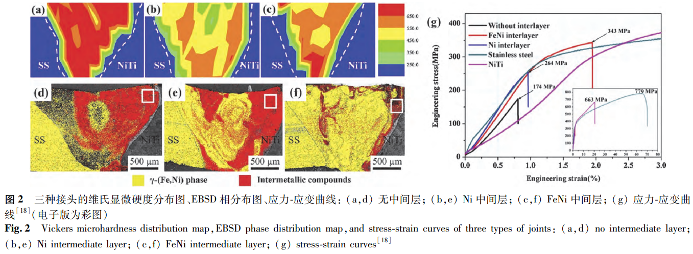 Niu等針對(duì)通過真空電子束焊接形成的三種NiTi/SS接頭開展了對(duì)比評(píng)價(jià),這三種接頭分別為電子束偏移到SS側(cè)且無中間層的接頭、添加Ni中間層的接頭以及添加FeNi中間層的接頭。各接頭的硬度分布情況如圖2a-c所示,由圖2a-c可知,焊縫區(qū)的硬度顯著高于兩種母材。這一現(xiàn)象的成因在于焊縫區(qū)中存在金屬間化合物以及發(fā)生了固溶強(qiáng)化作用。通過對(duì)比硬度圖與相分布(見圖2d-f)發(fā)現(xiàn),接頭中的金屬間化合物含量越多,其硬度越高。為進(jìn)一步探究對(duì)其力學(xué)性能的影響,Niu等對(duì)焊接樣品進(jìn)行了拉伸測(cè)試,結(jié)果表明FeNi中間層接頭展現(xiàn)出最優(yōu)的拉伸性能,Ni中間層接頭次之,而無中間層接頭的拉伸性能最差(見圖2g)。進(jìn)一步觀察發(fā)現(xiàn),三種樣品的斷裂位置均處于焊縫區(qū)內(nèi)靠近鎳鈦合金一側(cè)。借助掃描電子顯微鏡(SEM)和電子背散射衍射(EBSD)技術(shù)對(duì)裂紋分析可知,在無中間層接頭中,金屬間化合物以Fe2Ti作為主相,Ni3Ti則呈連續(xù)網(wǎng)狀分布于其中。裂紋徑直穿過金屬間化合物進(jìn)行擴(kuò)展,當(dāng)遇到較厚的Ni3Ti相時(shí),會(huì)出現(xiàn)輕微的偏轉(zhuǎn)現(xiàn)象。由此可見,該斷裂接頭呈現(xiàn)出解理斷裂的特征。在Ni中間層接頭里,金屬間化合物以Ni3Ti為主相,F(xiàn)e2Ti呈網(wǎng)狀分布于其中。裂紋的擴(kuò)展僅僅在Fe2Ti相中發(fā)生,并且會(huì)被Ni3Ti相阻擋。因此,該接頭斷口表現(xiàn)出沿晶斷裂的特征。對(duì)于FeNi中間層接頭而言,F(xiàn)e2Ti以柱狀枝晶的形態(tài)析出,Ni3Ti分布在其枝晶之間。裂紋主要出現(xiàn)在Fe2Ti枝晶內(nèi)部,不過會(huì)被枝晶間的Ni3Ti相阻斷。這種復(fù)合結(jié)構(gòu)能夠有效地阻止裂紋的進(jìn)一步擴(kuò)展,使得斷裂接頭同時(shí)具備解理和韌性斷裂的特征。