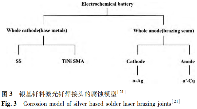 Li等選用銀基合金作為填充金屬,獲得激光釬焊NiTi/SS接頭,探究了兩種母材、填充金屬以及焊接接頭在不同pH值的人工唾液中的腐蝕行為。他們發(fā)現(xiàn)接頭的腐蝕主要發(fā)生在釬焊縫以及填充金屬與兩種母材的界面處,這是因?yàn)殁F焊縫的電極電位低于鎳鈦合金與不銹鋼,在人工唾液中成為原電池的陽極首先被腐蝕(見圖3)。接頭的耐腐蝕性與鎳鈦合金母材相近,優(yōu)于填充金屬,但低于不銹鋼母材。另一方面,人工唾液的pH值會(huì)對(duì)材料的耐腐蝕性造成影響,pH值越高,材料的腐蝕電位越高,電流密度越低,耐腐蝕性越好。