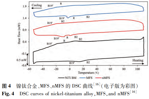 鎳鈦合金的形狀記憶效應(yīng)源于馬氏體相變,這是該合金的一項(xiàng)關(guān)鍵性能。激光焊接會(huì)致使合金的顯微組織發(fā)生改變,進(jìn)而對(duì)馬氏體相變以及逆相變過程產(chǎn)生作用,使得焊接接頭的形狀記憶效應(yīng)有別于鎳鈦合金母材,這一點(diǎn)在已有研究中有所提及。鑒于此,針對(duì)焊接接頭形狀記憶效應(yīng)開展研究極為必要,因?yàn)樾螤钣洃浐辖鸬南嘧兲匦允窃u(píng)估其功能特性的重要依據(jù)之一。Farhang等運(yùn)用差示掃描量熱法對(duì)鎳鈦合金以及存在或不存在磁場(chǎng)的NiTi/SS接頭進(jìn)行了測(cè)試,測(cè)試結(jié)果如圖4所示。其中,奧氏體(B2)、馬氏體(B19’)以及R相通過圖中的峰位得以確定,而奧氏體終止溫度Ai則被用作比較不同樣品之間轉(zhuǎn)變溫度的指標(biāo)。經(jīng)測(cè)試,鎳鈦合金的奧氏體終止溫度為24.7℃,與之相比,nMFS樣品的奧氏體終止溫度降低了約20℃,這表明nMFS樣品的功能特性發(fā)生了明顯改變。導(dǎo)致nMFS樣品轉(zhuǎn)變溫度降低的因素是多方面的,包括其內(nèi)部存在較多的缺陷、焊接過程中冷加工性能的消除、殘余應(yīng)力和晶粒生長(zhǎng)現(xiàn)象的出現(xiàn)以及Ni/Ti比的上升等。然而,MFS樣品的奧氏體終止溫度為24.1℃,基本保持了鎳鈦合金基材的轉(zhuǎn)變溫度水平,這意味著鎳鈦合金的功能特性在MFS樣品中得到了有效的保留。
