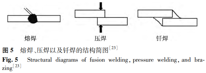 依據(jù)焊接過程所呈現(xiàn)出的特性,焊接可被劃分為三大類別,即熔焊、壓焊與釬焊,其相應(yīng)的結(jié)構(gòu)簡(jiǎn)圖如圖5所示。熔焊是指在無壓力的情況下對(duì)母材進(jìn)行加熱,使其熔化并相互混合,在冷卻后形成焊縫。氬弧焊、電子束焊、激光焊等均屬于熔焊。壓焊在焊接過程中必須對(duì)母材施加壓力,但對(duì)加熱沒有要求。它是一種使材料在固態(tài)下實(shí)現(xiàn)原子間結(jié)合而實(shí)現(xiàn)連接的焊接方法。壓焊可分為多種類型,如電阻焊、摩擦焊、超聲波焊等。釬焊是指通過加熱使焊材之間的填充金屬熔化,液態(tài)釬料與固態(tài)焊材相互擴(kuò)散,冷凝后形成接頭的方法。目前,針對(duì)鎳鈦合金與不銹鋼的焊接研究多聚焦于激光焊接領(lǐng)域。主要得益于激光焊接具備熱輸入量低、能量密度高以及熔合區(qū)與熱影響區(qū)范圍小等顯著優(yōu)勢(shì)。