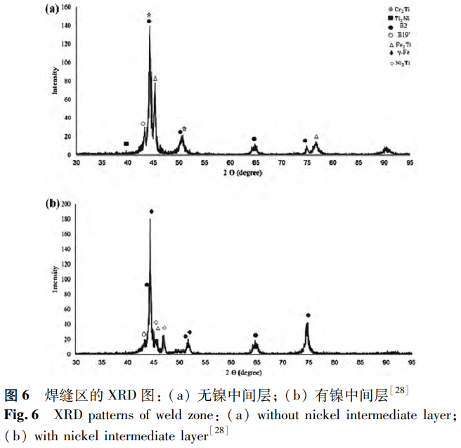 此外,添加中間層也是控制Fe-Ti等金屬間化合物形成的有效方法,能夠改善接頭性能。例如,在直接焊接的TC4/SS接頭中會(huì)產(chǎn)生大量Fe-Ti等金屬間化合物。Liu等采用復(fù)合中間層制備TC4/SS接頭,發(fā)現(xiàn)能夠防止Fe-Ti脆性相的產(chǎn)生,可以在很大程度上優(yōu)化接頭的力學(xué)性能,具有重要的研究?jī)r(jià)值。在鎳鈦合金與不銹鋼異種焊接方面,Asadi等研究了鎳中間層對(duì)激光焊接接頭的影響。通過x射線衍射(XRD)分析可知(見圖6),添加鎳粉后焊縫的Fe2Ti初生相轉(zhuǎn)變?yōu)镹i3Ti初生相,γ相和Ni3Ti相含量增加,脆性金屬間化合物含量減少。這是因?yàn)楹缚p中過量的鎳會(huì)造成Ti、Fe和Cr的減少,并且鎳是奧氏體形成元素和γ相穩(wěn)定劑,促進(jìn)了γ-Fe的形成。Li等深入研究了鎳中間層厚度對(duì)焊接接頭產(chǎn)生的影響。研究表明,隨著鎳層厚度逐步遞增,接頭內(nèi)的鎳含量相應(yīng)上升,脆性金屬間化合物減少,進(jìn)而使得接頭性能得以提升。當(dāng)鎳中間層的厚度增長(zhǎng)至50μm時(shí),接頭的抗拉強(qiáng)度以及斷裂伸長(zhǎng)率達(dá)到最大值,分別為372MPa和4.4%。然而,倘若鎳中間層厚度繼續(xù)增加,接頭內(nèi)部會(huì)形成更多的Ni3Ti相,同時(shí)會(huì)產(chǎn)生氣孔與縮孔等缺陷,最終致使接頭性能下降。這一研究結(jié)果與周海寬等等得出的結(jié)論相互吻合、保持一致。因此,為獲得性能優(yōu)異的焊接接頭,需要選擇合適的中間層厚度,即焊縫成分。此后,Li等研究了銅中間層、鈷中間層、38Zn-61Cu中間層對(duì)NiTi/SS接頭的影響,并在38Zn-61Cu中間層的研究中增加激光偏移技術(shù),在接頭處形成三個(gè)區(qū)域,即SS側(cè)熔合區(qū)、未熔化SS以及NiTi/38Zn-61Cu/SS形成的擴(kuò)散焊縫。在這些研究中觀察到類似的現(xiàn)象,即通過抑制脆性金屬間化合物的形成來改善接頭的力學(xué)性能。同時(shí),銅中間層的使用還可以消除熱應(yīng)力產(chǎn)生的裂紋,但銅中間層過厚會(huì)形成富銅球,其與周圍基體的結(jié)合相對(duì)較弱,有利于裂紋形核和擴(kuò)展。