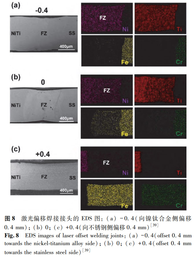 Zhang等對(duì)激光偏移焊接技術(shù)進(jìn)行了研究。激光偏移可以影響元素?cái)U(kuò)散,改變焊縫中的元素含量。如圖8所示,+0.4(向不銹鋼側(cè)偏移0.4mm)接頭的焊縫中主要為Fe和Cr元素,Ni和Ti元素的含量很少。Fe-Ti金屬間化合物被認(rèn)為是削弱NiTi/SS接頭質(zhì)量的主要因素。因此,+0.4(向不銹鋼側(cè)偏移0.4mm)接頭中Ti元素的減少使脆性金屬間化合物減少,從而導(dǎo)致接頭硬度的顯著降低以及拉伸性能的改善。類似地,Shamsolhodaei等通過激光偏移焊接方法對(duì)超彈性鎳鈦合金絲與不銹鋼絲進(jìn)行連接,發(fā)現(xiàn)激光偏移改變了接頭焊接區(qū)的元素分布,提升了接頭性能。