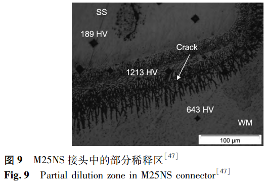 除了選擇合適的焊接工藝參數(shù)外,還可以通過加入中間層的方法來改善焊接質(zhì)量。Oliveira等以鎳鈦合金和Inconel625為填充材料,探究了不同填料以及熱處理對(duì)氬弧焊焊接接頭的影響。在接頭中觀察到通過外延凝固形成的枝晶,枝晶的生長(zhǎng)導(dǎo)致枝晶間空隙中存在溶質(zhì)排斥,并可能形成金屬間化合物,因此,裂紋主要沿著枝晶間區(qū)域形成。無序晶格減緩了位錯(cuò)的遷移率和原子擴(kuò)散過程,導(dǎo)致結(jié)構(gòu)中內(nèi)應(yīng)力的形成,提升了其硬度和脆性。相比于鎳鈦合金填料,使用Inconel625填料的接頭通常具有較高的抗拉強(qiáng)度,最佳可達(dá)到286MPa。對(duì)于未經(jīng)焊后熱處理的樣品,在焊縫和母材之間的熔合線處形成了清晰界面區(qū)域,即部分稀釋區(qū)(見圖9),該區(qū)域會(huì)析出金屬間化合物。在進(jìn)行熱處理之后,焊接接頭中不存在部分稀釋區(qū)。且焊后熱處理減小了接頭中的殘余應(yīng)力,使接頭具有更高的力學(xué)性能。