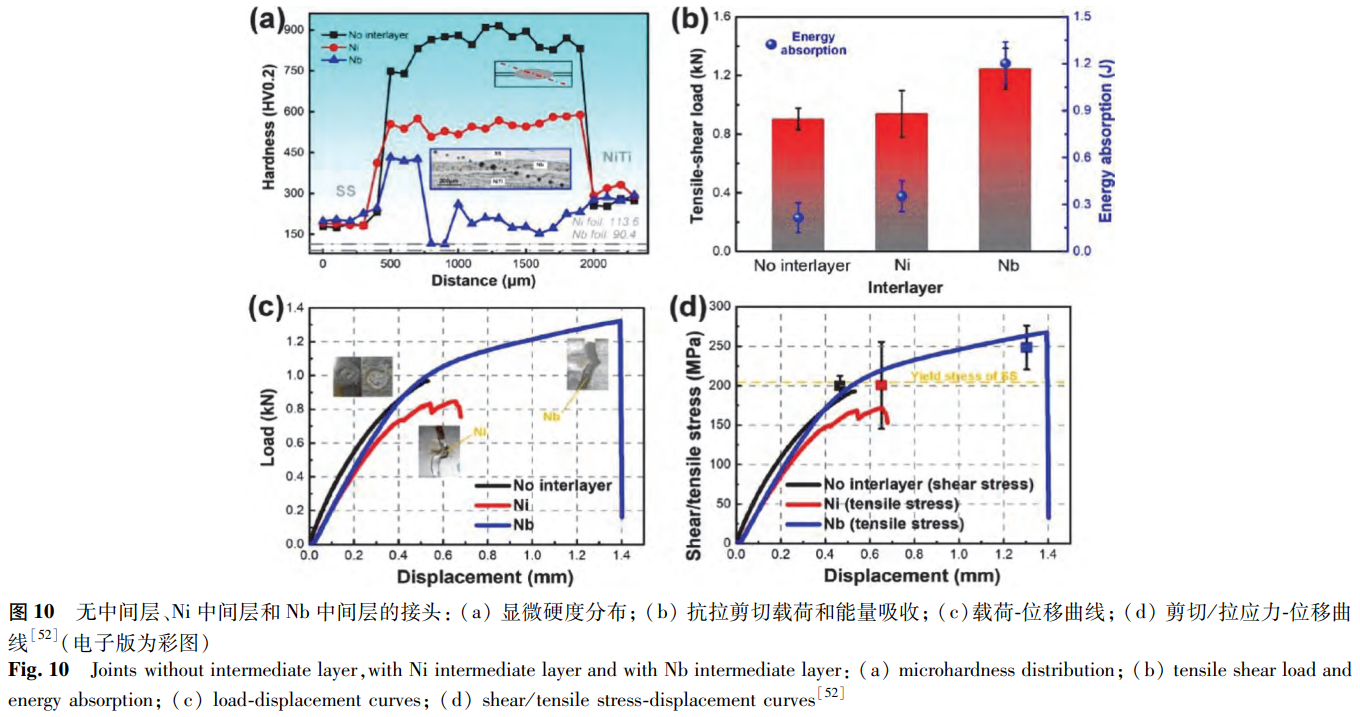 通過替換有害相和限制混合這兩種方法可以控制焊接接頭中的金屬間化合物。為此,Zhang等選擇了低熔點(diǎn)Ni和高熔點(diǎn)Nb作為中間層。在Ni中間層接頭中,隨著脆性Fe2Ti相的替換,以Ni3Ti為主的焊縫具有更好的延展性。但鎳的蒸發(fā)會(huì)導(dǎo)致大氣孔、縮孔、裂紋的產(chǎn)生,使有效連接面積減小,造成接頭強(qiáng)度降低。在Nb中間層接頭中,熔合區(qū)被未熔融的Nb分離,這抑制了不同熔融金屬間的混合,并在界面處形成低脆性的含鈮共晶結(jié)構(gòu)。該接頭強(qiáng)度在斷裂載荷方面提高了38%,在能量吸收方面顯著提高了460%,如圖10所示。由此可知,高熔點(diǎn)中間層具有實(shí)現(xiàn)可靠NiTi/SS電阻點(diǎn)焊接頭的巨大潛力。
