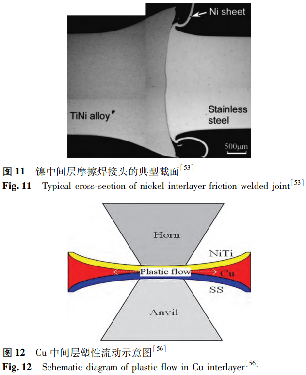 在超聲波焊接過程中,材料不會(huì)熔化,這抑制了過渡相的形成,適合異種金屬的焊接。其核心是超聲振動(dòng),高頻超聲振動(dòng)有助于促進(jìn)焊接時(shí)材料的聲軟化。在實(shí)際等效軟化效果的條件下,熱軟化所需的熱能輸入是超聲能量的107倍。Chen等發(fā)現(xiàn)未添加中間層的NiTi/SS超聲波點(diǎn)焊接頭具有機(jī)械互鎖結(jié)構(gòu),抗拉強(qiáng)度可達(dá)到404.71N。Ao等制備了具有Cu中間層的NiTi/SS超聲波點(diǎn)焊接頭,并研究了不同焊接能量輸入對(duì)接頭的影響。研究發(fā)現(xiàn),焊接時(shí)的接觸壓力不均勻?qū)е翪u中間層發(fā)生塑性流動(dòng)(見圖12),使接頭的焊接界面呈現(xiàn)出NiTi/Cu/304SS界面和NiTi/304SS界面兩種類型。在不同能量輸入下,異種接頭的兩個(gè)界面處均未發(fā)現(xiàn)金屬間化合物。在性能方面,平均拉伸剪切載荷先增后減,在750J時(shí)達(dá)到690N的最大值。這是因?yàn)殡S著能量輸入的增大,熱輸入增加,材料軟化,銅中間層塑性變形,使得結(jié)合區(qū)擴(kuò)展到整個(gè)界面,接頭性能顯著提升。當(dāng)能量輸入過大時(shí),由于銅中間層的斷裂,鎳鈦合金與不銹鋼直接接觸,接頭性能降低。Chen等使用Al中間層進(jìn)行了相似的研究,鋁中間層的塑性流動(dòng)也產(chǎn)生了雙界面。不同的是,焊接能量較高時(shí),界面處會(huì)形成Fe4Al13脆性相。當(dāng)焊接能量適中、界面機(jī)械聯(lián)鎖程度高、元素?cái)U(kuò)散距離長(zhǎng)、不存在連續(xù)脆性相時(shí),接頭性能最佳。