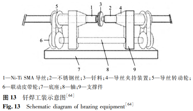 閻開婷等公開了一種血管內(nèi)鎳鈦合金導(dǎo)絲、導(dǎo)絲焊接工裝及導(dǎo)絲焊接方法。焊接工裝如圖13所示,在氬氣保護(hù)氣氛下,利用夾具連續(xù)轉(zhuǎn)動(dòng)線材進(jìn)行激光小光斑多點(diǎn)環(huán)繞加熱,使釬料熔化包覆在階梯狀端頭上,完成鎳鈦合金與不銹鋼的端部連接。