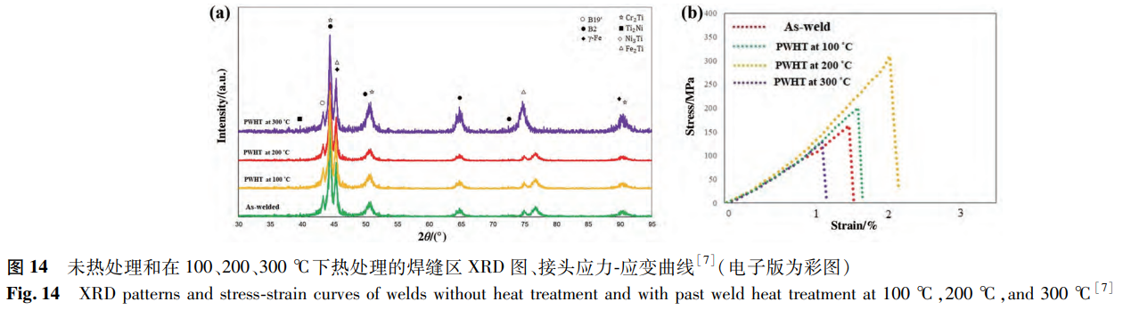 Asadi等研究了焊后退火溫度對(duì)激光焊接NiTi/SS接頭的影響。SEM結(jié)果顯示,經(jīng)過100℃和200℃的退火后,接頭的顯微組織沒有明顯變化。而在300℃退火的接頭中觀察到較大的枝晶結(jié)構(gòu)。相組成方面,相較于無焊后退火處理的接頭,100℃和200℃的退火處理對(duì)物相無明顯影響,但300℃的熱處理會(huì)導(dǎo)致金屬間化合物增加(見圖14a)。因此,焊接接頭的硬度和拉伸性能均隨退火溫度的升高而改善,但退火溫度達(dá)到300℃時(shí)力學(xué)性能惡化。如圖14b所示,200℃接頭具有最高的抗拉強(qiáng)度,其值高達(dá)310MPa,是未熱處理接頭抗拉強(qiáng)度的1.91倍。而300℃接頭的抗拉強(qiáng)度僅為129MPa,低于未熱處理接頭。類似的研究也呈現(xiàn)出相同的結(jié)果,經(jīng)過200℃焊后熱處理的樣品的抗拉強(qiáng)度由213MPa提高到393MPa,耐腐蝕性能也得到提高。