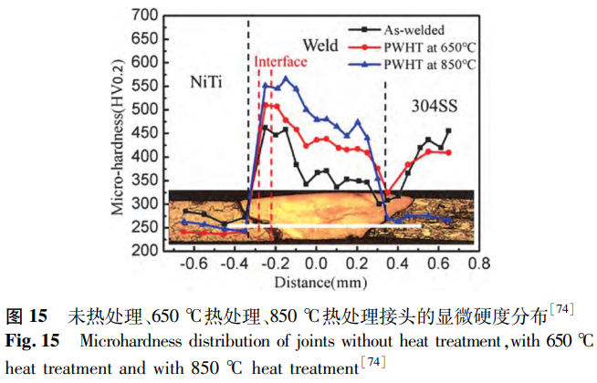 Chen等研究了焊后退火工藝對(duì)以鎳為中間層的NiTi/SS接頭的影響。研究表明,未熱處理接頭的NiTi/Ni界面可分為兩層,隨著焊后熱處理溫度的升高,NiTi/Ni界面和焊縫處析出越來越多的Ni3Ti金屬間化合物,在850°C接頭的NiTi/Ni界面中已全部轉(zhuǎn)變?yōu)镹i3Ti相。這使得所有接頭的硬度在NiTi/Ni界面達(dá)到最大,且焊接區(qū)硬度隨著退火溫度的升高而提高,如圖15所示。由于焊后熱處理使接頭組織逐漸趨于均勻化,焊縫的最大硬度與平均硬度之間差值減小,接頭的抗拉強(qiáng)度提高,在850℃接頭中達(dá)到643MPa的最大值,是未熱處理接頭抗拉強(qiáng)度的2.12倍。因此,焊后熱處理可以改善焊接接頭的性能,但為了達(dá)到預(yù)期效果,需要選擇合適的熱處理工藝。